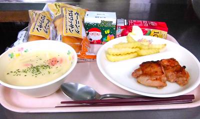 ☆X'mas特別メニュー クロワッサン、りんごジュース、フライドポテト、バーベキューチキン、クリスマスケーキ、コーンスープ